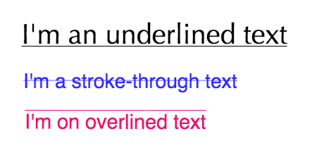 Text decoration allows to add undeline, overline, or strike-through to a text. This is similar to CSS, but Fabric goes a little further and allows to use any combination of the above together. So you can have a text that's both underline and overline, or underline and strike-through, and so on.